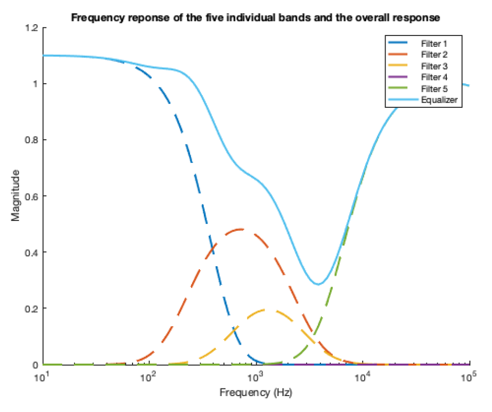 In this project, a system consisting of 5 frequency selective-filters with different predetermined settings is used to process audio signals. The main idea of the system is to sift out different frequency bands of a signal via RC filters and scale them with preset weights, and the final output signals are a combination of these modified bands. The equalizers with different presets introduced in this paper are designed to achieve various goals, such as bass/treble enhancement and siren attenuation, by enhancing or decreasing signals at different frequency bands. The figure is a designed equalizer for enhancing the audio for lecture recording.