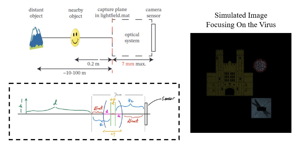 I designed an optical imaging system, the total length of which is less than 7 mm, using off-the-shelf lenses for focusing images onto a digital CMOS camera sensor. I used the thick lens model, implemented the system into MATLAB, and simulated the camera using virtual light rays. I used the system to produce in-focus images for multiple objects at various distances, and then estimated the distance of the object based on my setup.