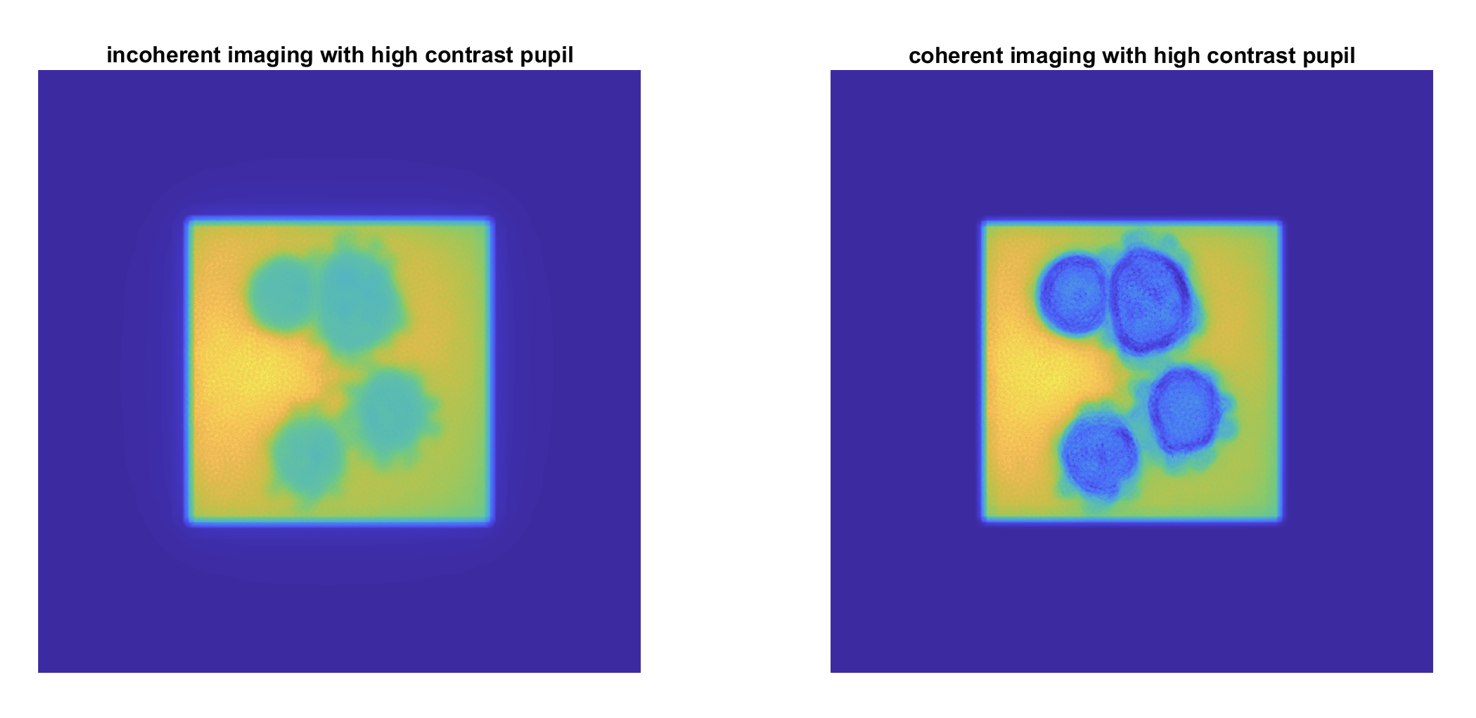 I designed computational phase mask for high-contrast imaging of a transparent hypothetical virus particle. I implement interferometry within the phase mask for a 4f system to improve contrast in the final image. I imaged the hypothetical object with both coherent light and incoherent light.